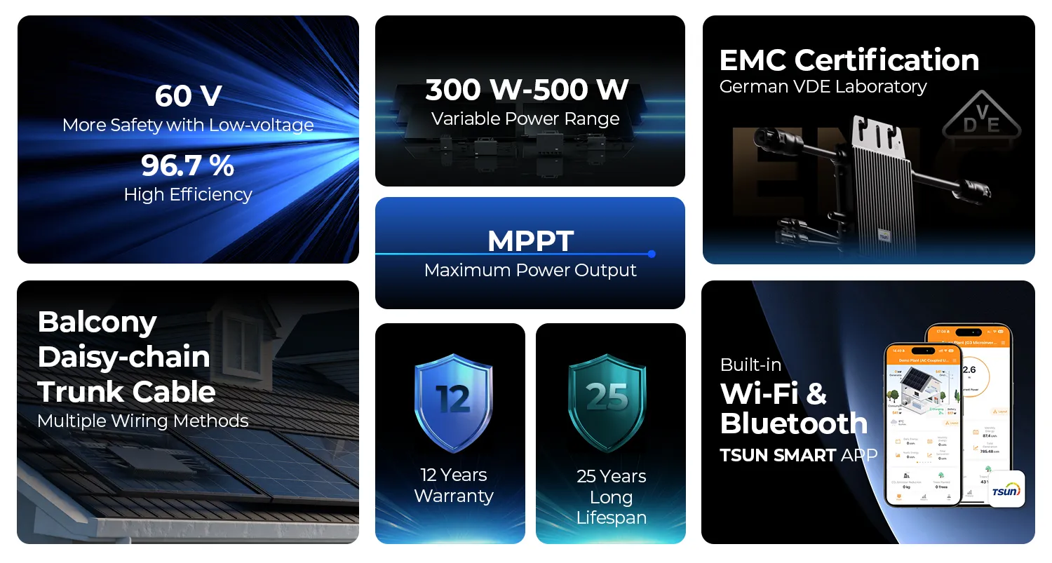 The Microinverter 1-in-1 is a powerhouse of performance. Equipped with advanced MPPT technology, an ultra-low 16 V MPPT Minimum voltage, and compatibility with high-wattage PV modules (up to 600 W), it cranks out up to 500 W of output—ensuring every ray of sunlight is turned into usable energy.